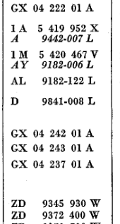 | 000.000 | Nogle standarddele blev identificeret med deres numre efter førkrigs-systemet helt frem til sidst i 1960'erne, hvor denne type numre blev konverteret til de nye serier - typisk ZC-serien. | ||