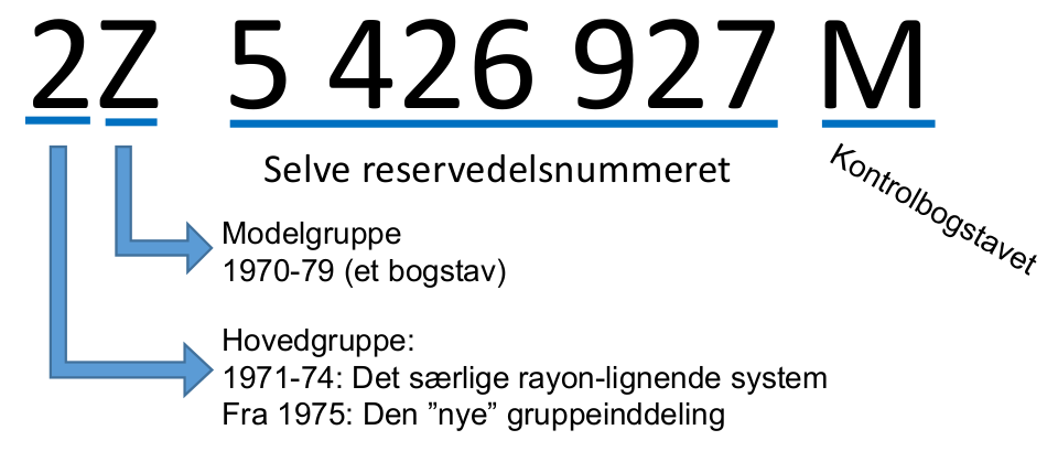 Som man kan se i eksemplet til højre (fra samme katalog), havde det den store skønhed at alle kendte numre nu kunne passe ind i den samme skabelon, hvilket sikkert var krævet i forbindelse med håndtering på computer på dette tidspunkt. Det var jo hulkortenes æra, hvor hurtig behandling af lange lister i faste kolonneformater var dagens orden. Hvorfor var det mon præcis et 9-tal og ikke et andet tegn? Den sandsynlige forklaring på det er nok at man på dette tidspunkt må have troet at alle fremtidens numre ville være på samme form som den nyeste nummerserie på det tidspunkt, altså GX-numrene, og det første ciffer efter præfix kan i et GX-nummer være 0-8, men netop ikke 9, der så kunne reserveres til numre i andre systemer. Hvis denne forklaring er rigtig, stemmer det også med at f.eks. en standard blinklyspære skiftede nummer fra 706.750 til netop ZC 9706 750 U. Der findes i øvrigt også nogle helt få numre som har et ekstra 8-tal. F.eks. hedder en kobling til en HY efter 1968 HY 8312 000 B. Hvor det så kommer fra, kan man godt have forskellige teorier for, men der synes ikke at tegne sig et ordentligt billede endnu. Observationer modtages gerne. Lige på dette tidspunkt omkring 1970 havde man således skabt et system, hvor (næsten) alle numre for første gang var i samme format: 2 eller 3 tegn + 7 cifre + suffix-bogstav. Hvis man betragter serierne ZA, ZB og ZF som værende i overensstemmelse med dette system på trods af deres afvigende antal cifre, varede denne periode med det forenede format helt indtil introduktionen af Peugeot-dele i 78/79-serien med LN i 1976. |