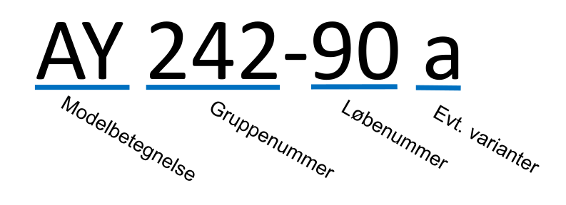 med modelbogstaver+gruppenummer+løbenummer+bogstav, men de er alligevel