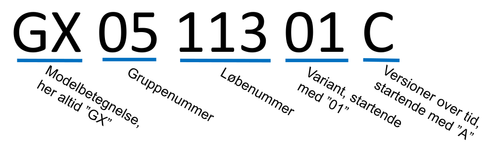 Højre/venstre adskilles som regel ved at venstre-delen har et lavere løbenummer (kan både være det 3-cifrede og det 2-cifrede), aldrig ved at skifte bogstav A/B. F.eks. hedder venstre blinklys GX 60 166 01 A og højre GX 60 167 01 A, hvor forskellen markeres ved det 3-cifrede løbenummer, medens venstre/højre solskærm uden spejl hedder GX 53 192 01 A hhv. GX 53 192 02 A.