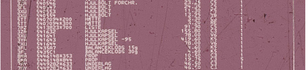 | CAT 000000 | Reservedelskataloger - findes både på papir og som microfiche. Hvis det er en prisliste er der desuden et H bagpå nummeret | ||