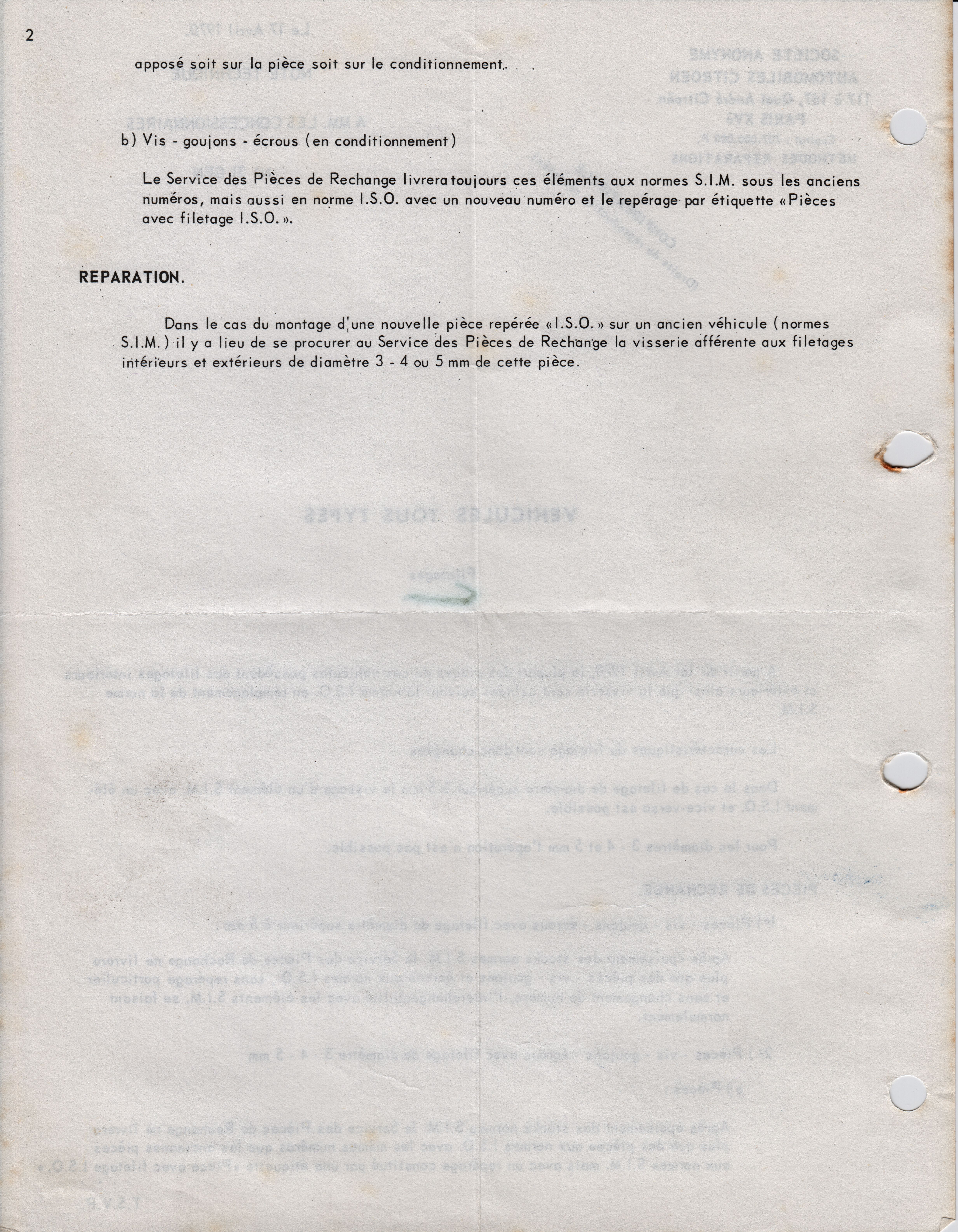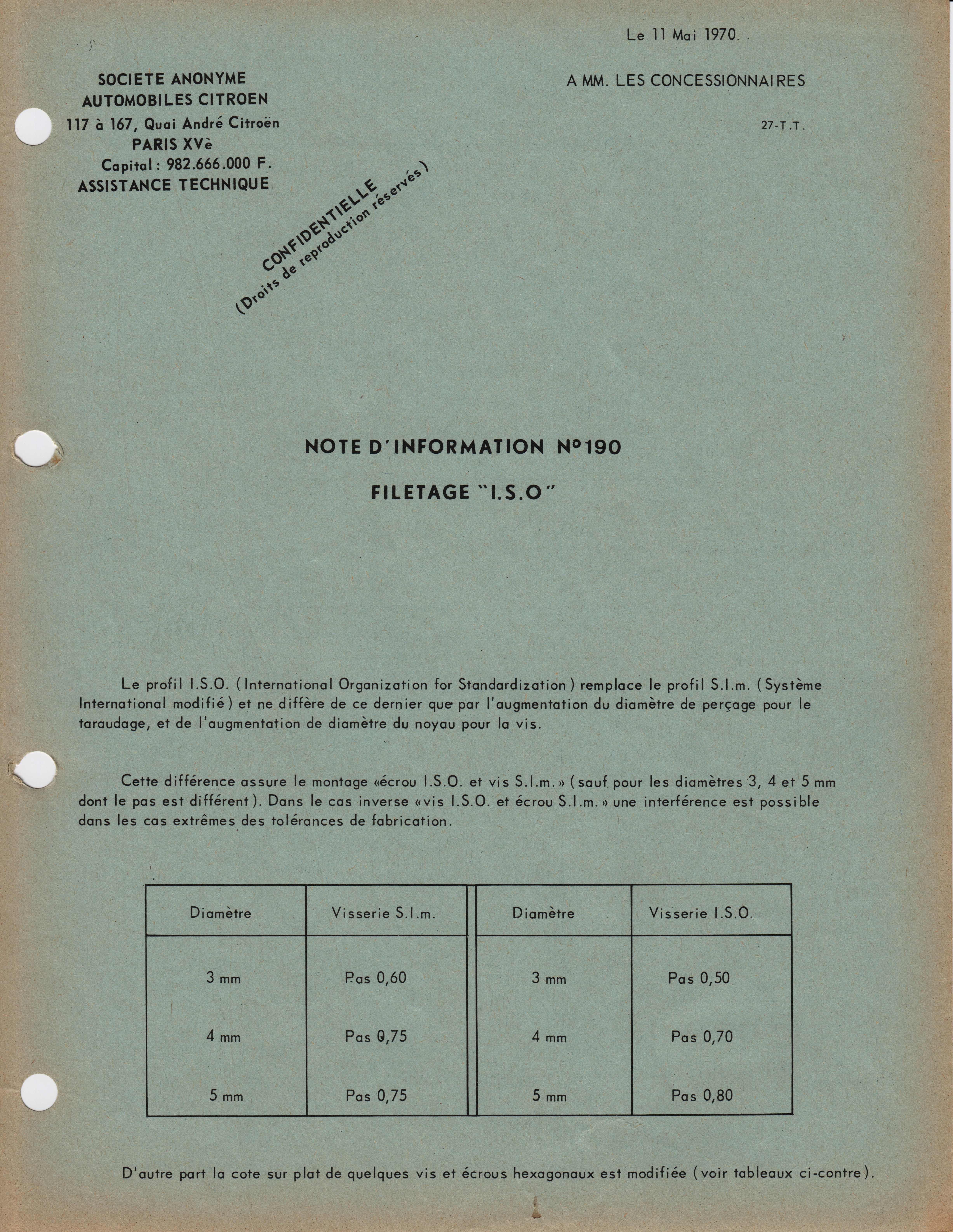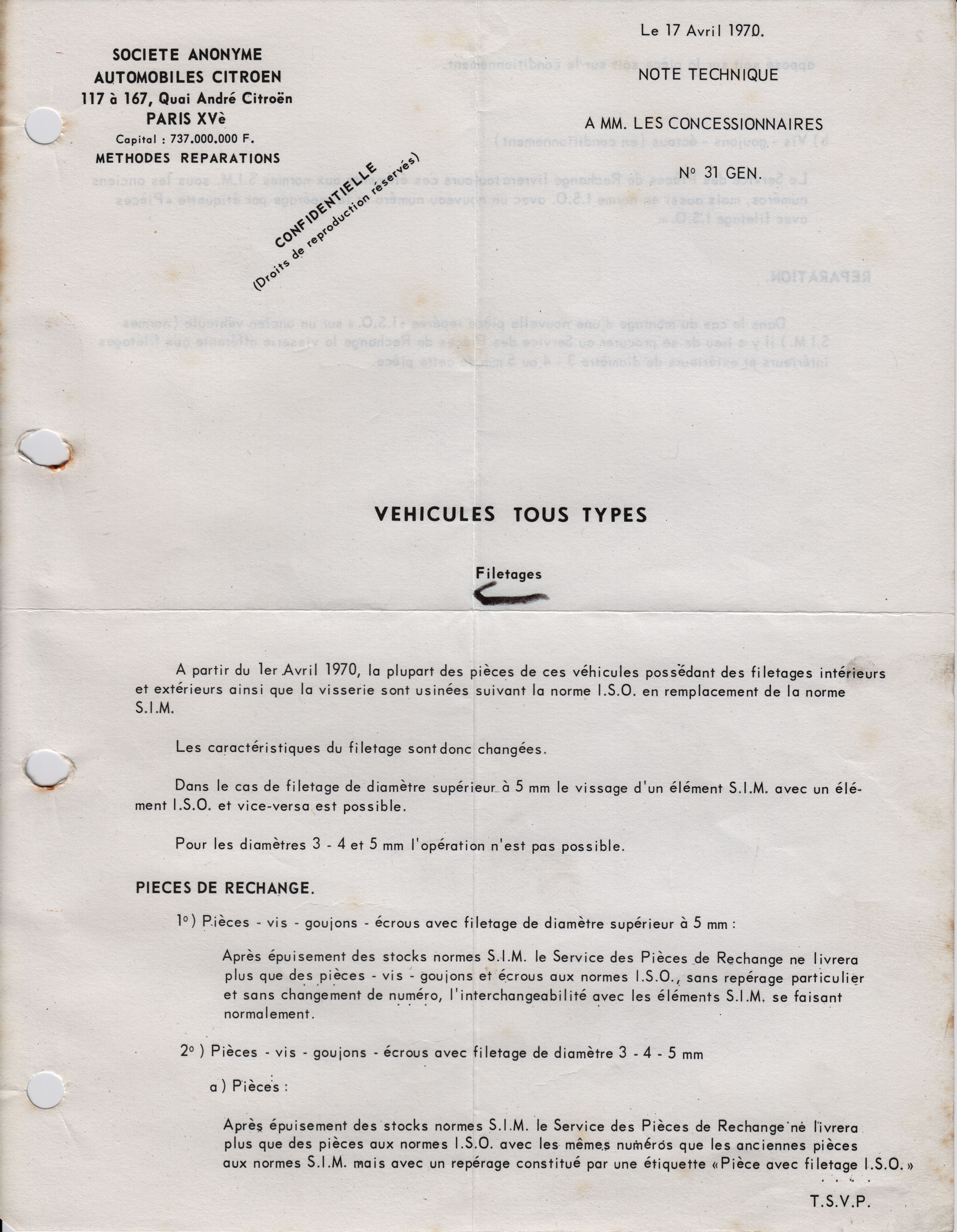 If�lge et fransk cirkul�re ("note technique") til forhandlerne fra Citroën-fabrikkerne fra den 11. maj 1970 brugte man f�r den tid en (essentielt set) fransk norm for gevind, der hed SIM (Système International Modifié). Denne blev erstattet af den nu brugte (essentielt set tyske) ISO (International Standardization Organization) norm.