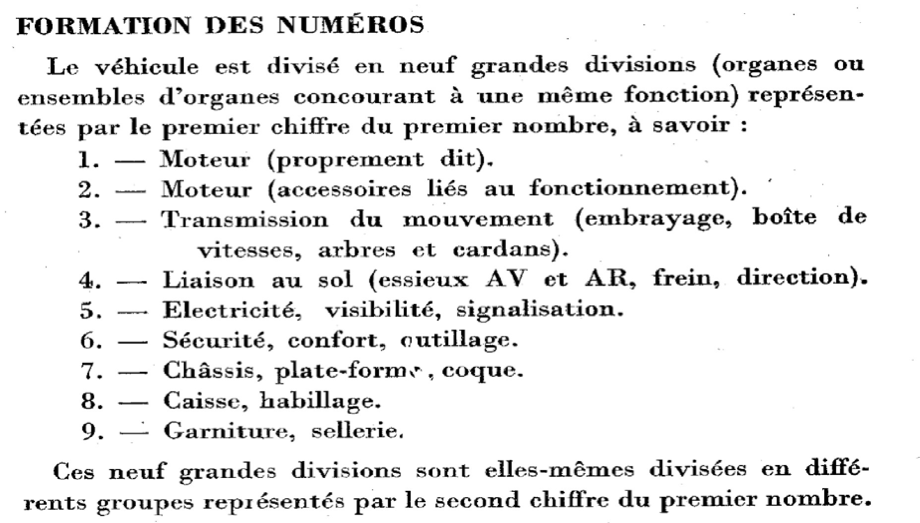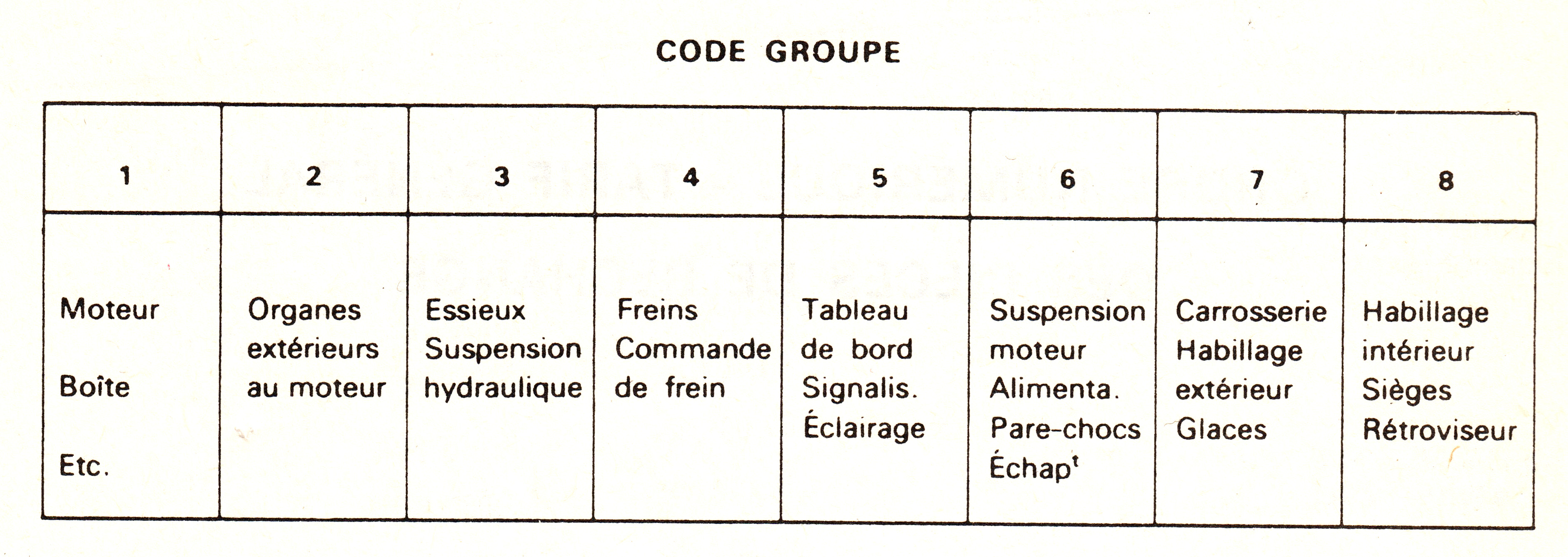 Gruppebetegnelsen best�r af et ciffer, der angiver hvilken del af bilen (eller gruppe af organer, som det hedder p� fransk) reservedelen tilh�rer, efterfulgt af et eller to bogstaver, der angiver hvilken model reservedelen oprindelig var tilt�nkt. Imidlertid kan en reservedel ogs� sagtens passe p� andre dele af bilen eller p� andre modeller, men f�rste gang en reservedel kom i kataloget, havde den den angivne gruppebetegnelse. Dette er dog ikke helt statisk, da der faktisk er eksempler p� at nogle reservedele har skiftet gruppebetegnelse i l�bet af deres levetid.