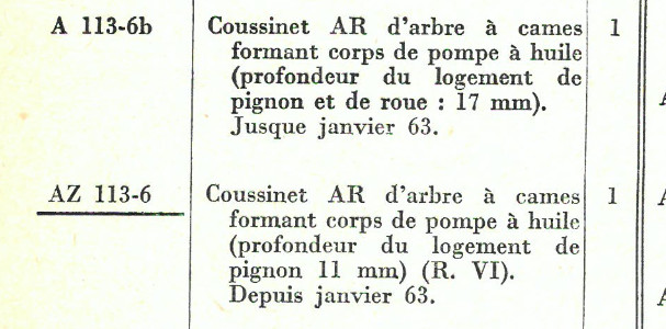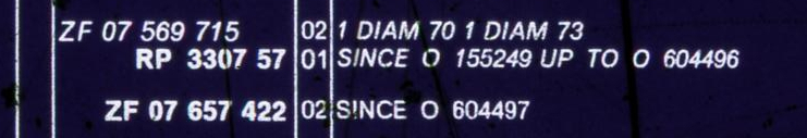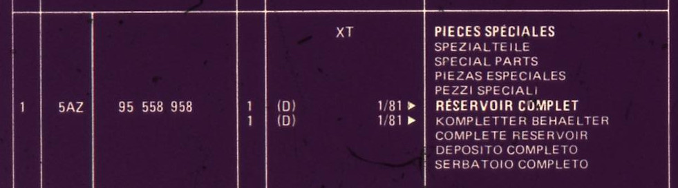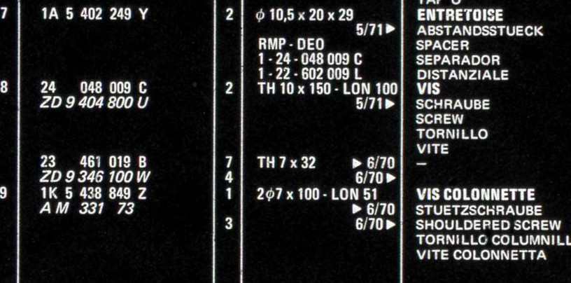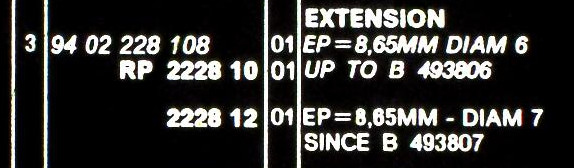 Forklaringen finder man i nogle af de tekniske cirkulærer, f.eks. Note Technique kapitel 7 no. 4 fra juni 1989, som ses her til højre. Her kan man se at der er sket en ændring af hjulnavet foran fra stelnummer 604497. Det nye nav har reservedelsnummeret ZF 07 657 422. Finder man nu det i reservedelskataloget MIC00224A fra 1995 (herunder) ser man at der står "SINCE O 604497", der altså må betyde "siden stelnummeret 604497".
