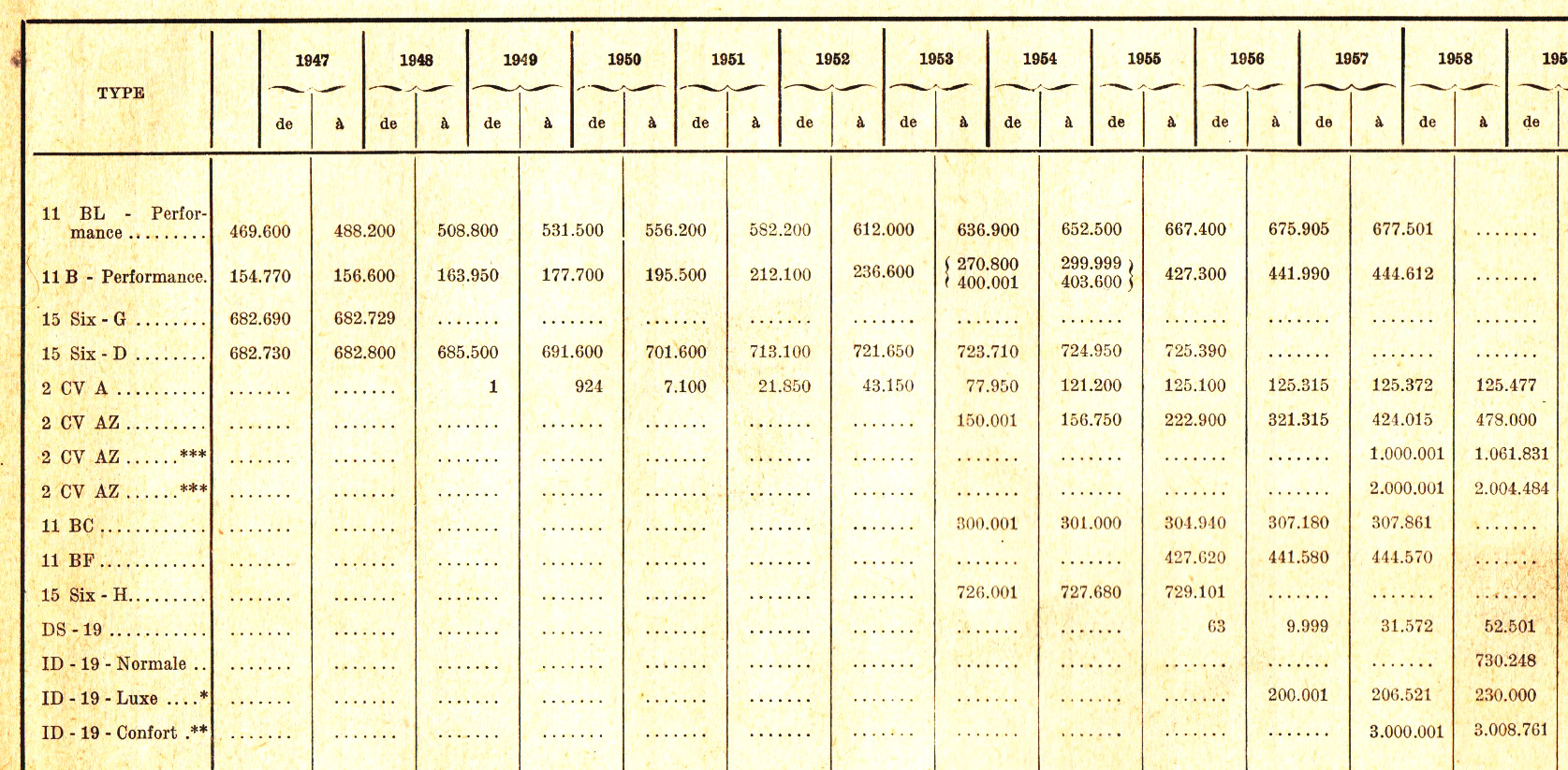 Når man skal afgøre hvornår en Citroën er produceret, har den klassiske metode været at se på chassisnummeret. Andre gode citroënister - især Jens Møller Nicolaisen og Gert Bue Larsen - har imidlertid forsket i dette felt, og fundet ud af at det langt fra er en præcis metode, med mindre man har adgang til produktionsprotokollerne. De var i en periode tilgængelige i Citroëns conservatoire i Aulnay, men nu om dage befinder de sig i PSA-koncernens nye "superarkiv" på Hérimoncourt-afdelingen, der ligger ved Sochaux i Østfrankrig, hvor de nu kun er tilgængelige for de dér ansatte (suk!). Selv med adgang til disse produktionsprotokoller kan der være yderligere unøjagtigheder, som bl.a. kommer af at samlefabrikker som den i Sydhavnsgade ikke altid satte stelnumrene i bilerne fortløbende.
