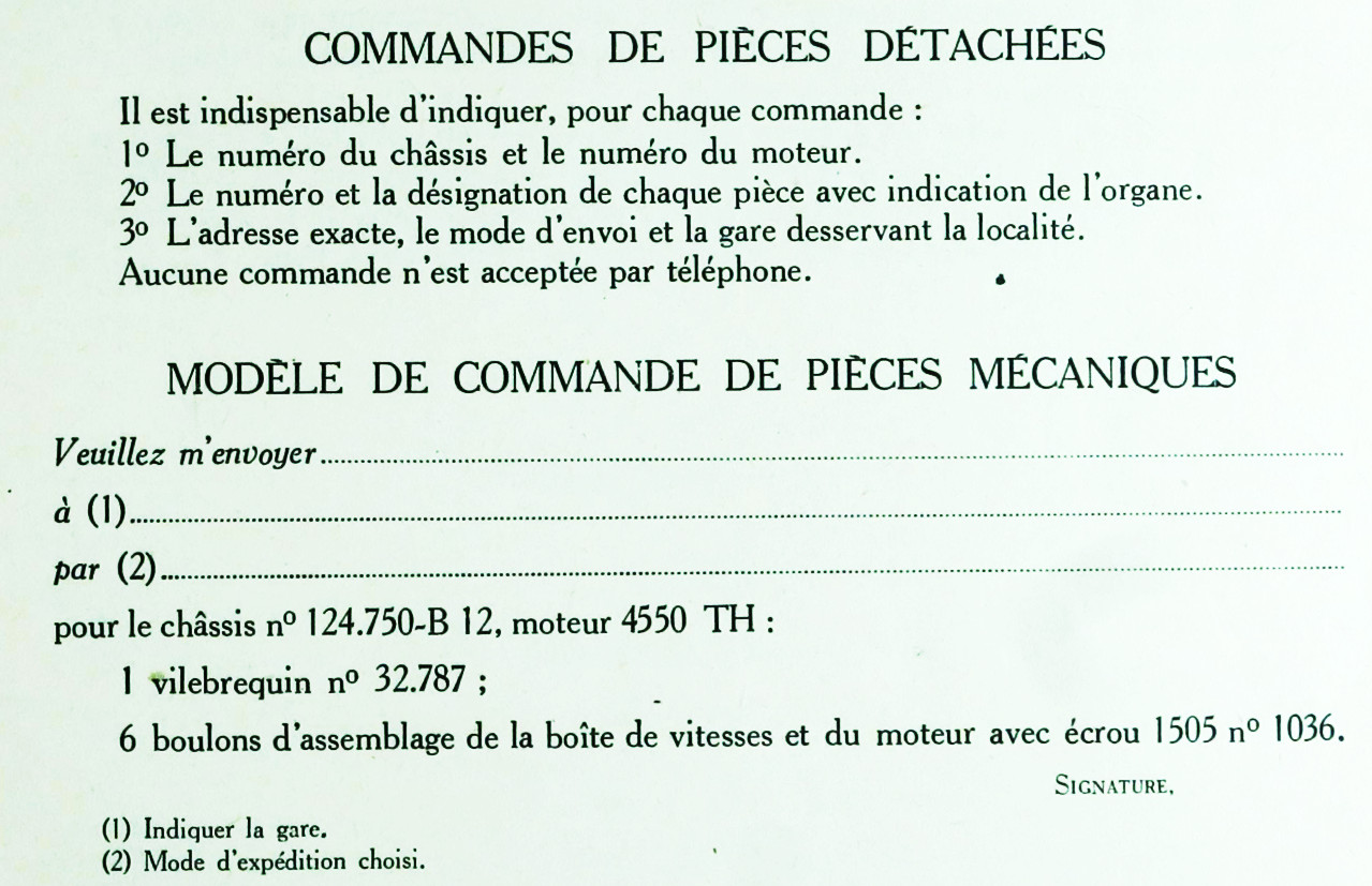 Her er et eksempel fra Citroëns store samlekatalog 1919-1928 hvor det beskrives i indledningen hvordan man skal udfærdige en reservedelsbestilling. Det er obligatorisk at medsende chassisnummer og motornummer.