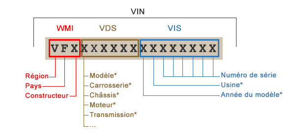 | WMI | World Manufacturer Identifier | Fabrikantkode som giver en entydig identifikation af producenten | Fabrikantkoden st�r i position 1-3, undtagen hvis denne bygger mindre end 500 biler om �ret. I dette tilf�lde er det tredie tegn altid 9 og pladserne 12-14 bruges til resten af fabrikantkoden. |